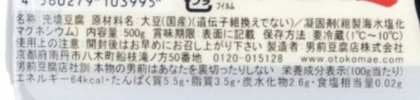 ここ↑に書かれている「凝固剤」が「にがり」のことです。これは男前豆腐の成分表示ですね。