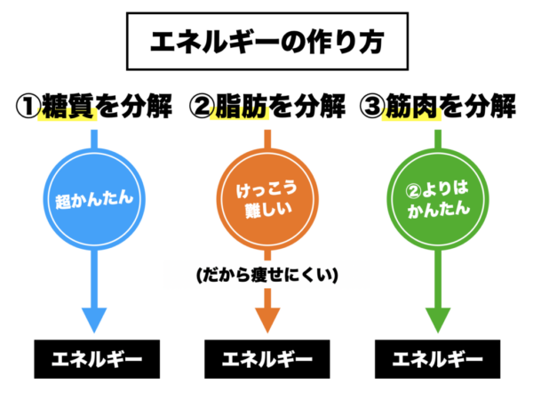 じつは③の筋肉を分解してエネルギーを作り出す方が楽ちんなんです。