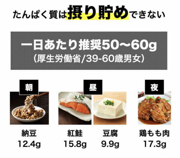 この量をきちんと3食にわけてとることで、カラダの中でしっかり利用(筋肉の合成など)されます。