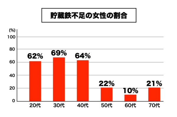 20~40代の女性にしぼると、なんと約65%が鉄分不足!