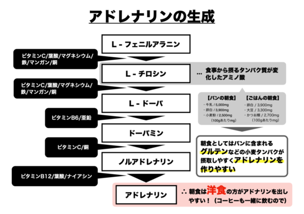 これらのことからも分かりますようにごはんの朝食よりパンの朝食の方がアドレナリンを作りやすく血糖値を上げやすいということが出来ると思います。
